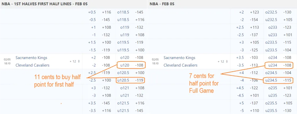 Trying to buy a half point at halftime? You’ll notice the sportsbook values that half point much more as it is much more expensive. There is a 50% increase on the vig (juice) when you buy a half point in a halves market!